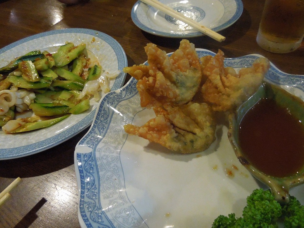 揚げワンタン、イカとキュウリの和え物が絶品!